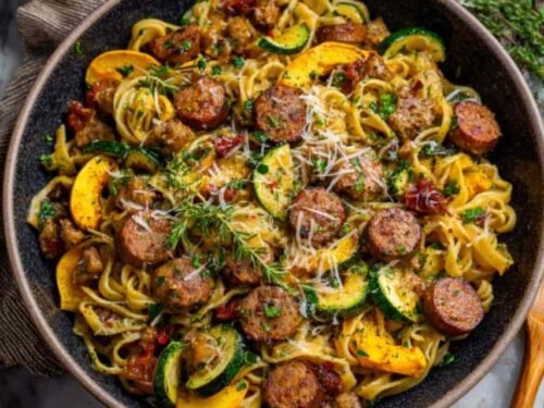 This autumn pasta skillet combines roasted butternut squash, crispy Brussels sprouts, and smoky sausage in a garlic butter sauce that brings cozy fall flavors to your weeknight table. I developed this recipe after buying way too much butternut squash at the farmers market last October, and it quickly became our go-to for busy Tuesday nights. The roasted vegetables get tender and caramelized while the pasta cooks, then everything comes together in one skillet with just butter, garlic, and fresh thyme.
