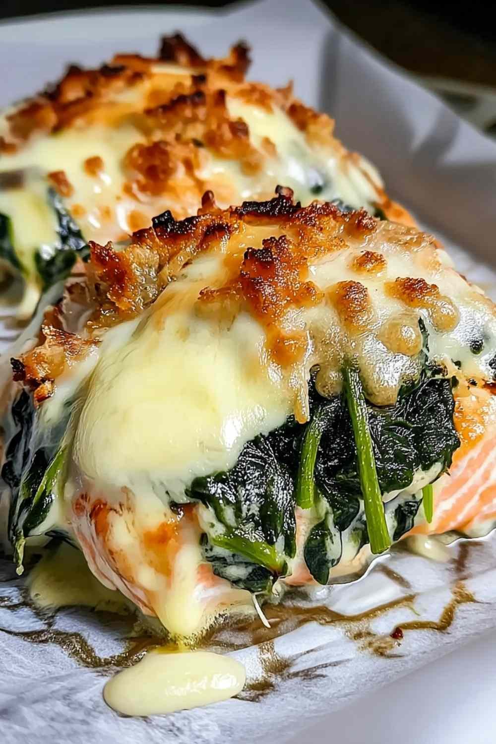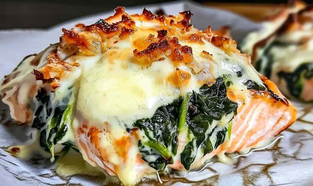 - Place salmon fillets skin-side down in the prepared baking dish (or flat if using skinless). Spread the creamy spinach mixture evenly over each fillet, then sprinkle generously with shredded mozzarella cheese, covering all the spinach.