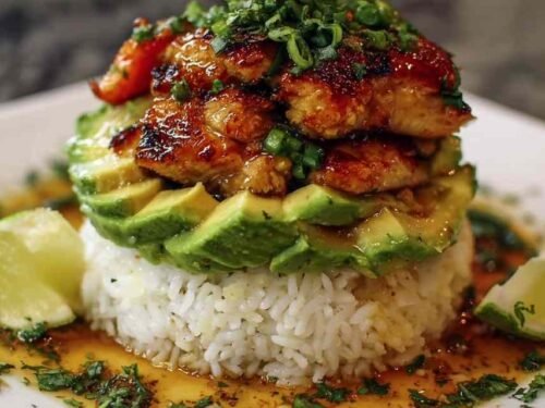 This Honey Lime Chicken Avocado Rice Stack combines sweet citrus chicken, creamy avocado, and fluffy cilantro rice in one stunning dish.
