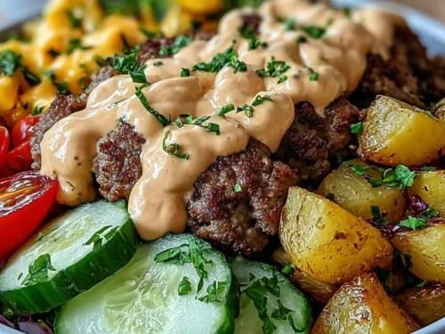 Crispy Oven-Baked Sweet Potato Fries: Fries and burgers are a natural pairing, and burger bowls are no exception. Our crispy oven-baked sweet potato fries deliver that satisfying crunch without the deep fryer, making them a lighter match for this already hearty bowl.