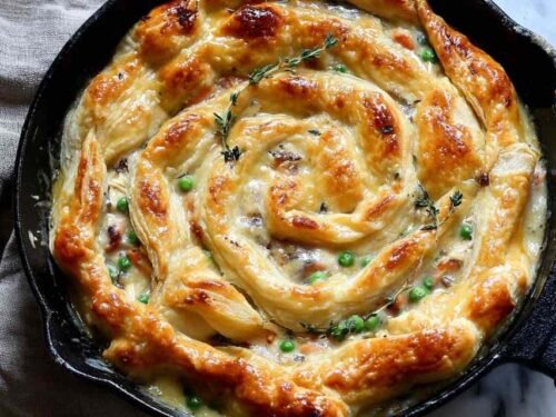 Cast Iron Skillet Chicken Pot Pie brings homestyle comfort to your table with a stunning rosette puff pastry crust that looks fancy but comes together easily. This one-pan wonder combines tender chicken, savory vegetables, and a creamy sauce in your trusty cast iron skillet for a satisfying meal that feeds the whole family.