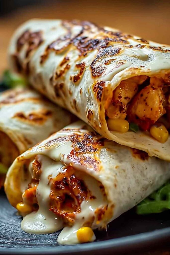 Tender chicken wrapped with creamy garlic sauce, melted cheese, and fresh vegetables in soft flour tortillas for a quick and satisfying meal.