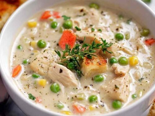 Creamy chicken pot pie soup loaded with tender chicken, vegetables, and herbs in a rich broth. Ready in 35 minutes and served with warm biscuits.