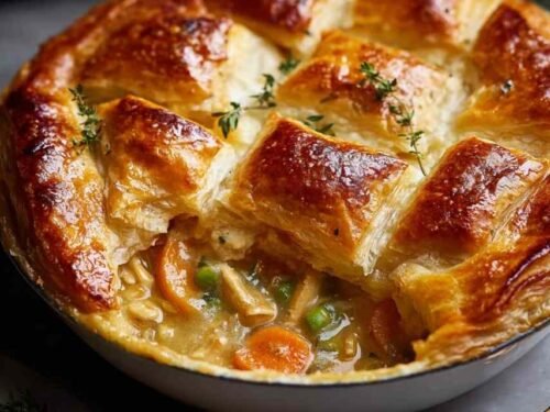 There’s something magical about pulling a bubbling pot pie from the oven on a cold evening. The golden pastry, the savory aroma filling your kitchen, and knowing that dinner is both impressive and surprisingly simple. I started making this version when I realized traditional pie crust was keeping me from enjoying pot pie more often. Swapping in puff pastry changed everything. Now I can have this comforting classic on the table in about an hour, using rotisserie chicken to make it even easier. The flaky, buttery layers on top paired with that rich, herb-infused filling create the perfect cold weather dinner.