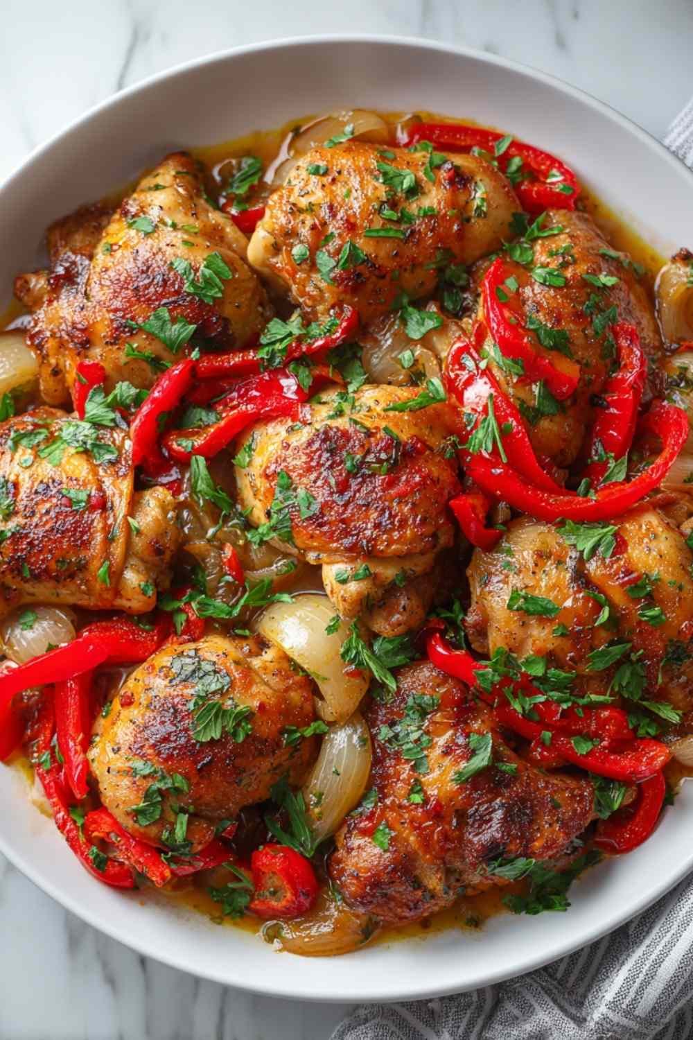 Reheat gently on the stovetop over medium-low heat until the chicken reaches 165°F internally, adding a splash of chicken broth if the sauce has thickened too much. I avoid the microwave for this one – stovetop reheating preserves the texture of the chicken skin much better.