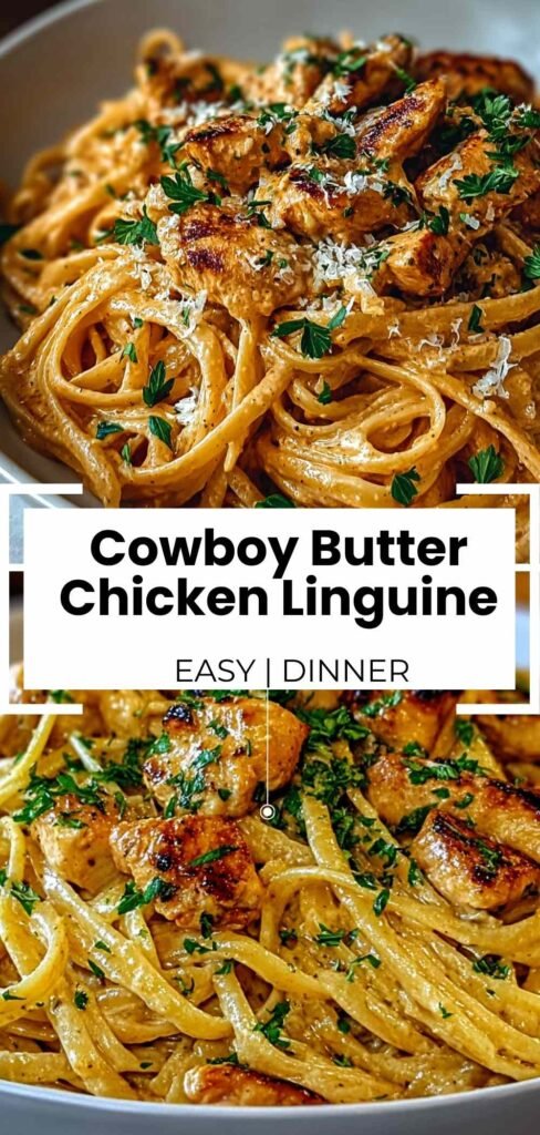 Tender chicken pieces in a luscious, creamy cowboy butter sauce with garlic, fresh herbs, and bright lemon, served over linguine pasta
