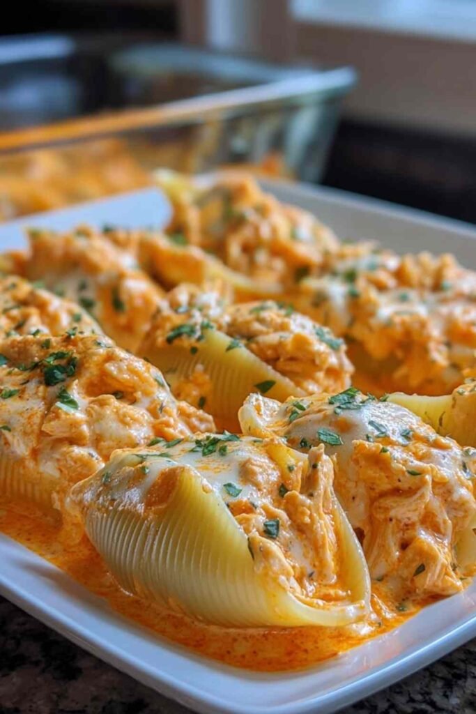 - Using a spoon or small cookie scoop, carefully fill each cooked shell with 2-3 tablespoons of the buffalo chicken mixture. Arrange the filled shells in the prepared baking dish in a single layer, leaving small gaps between each shell.