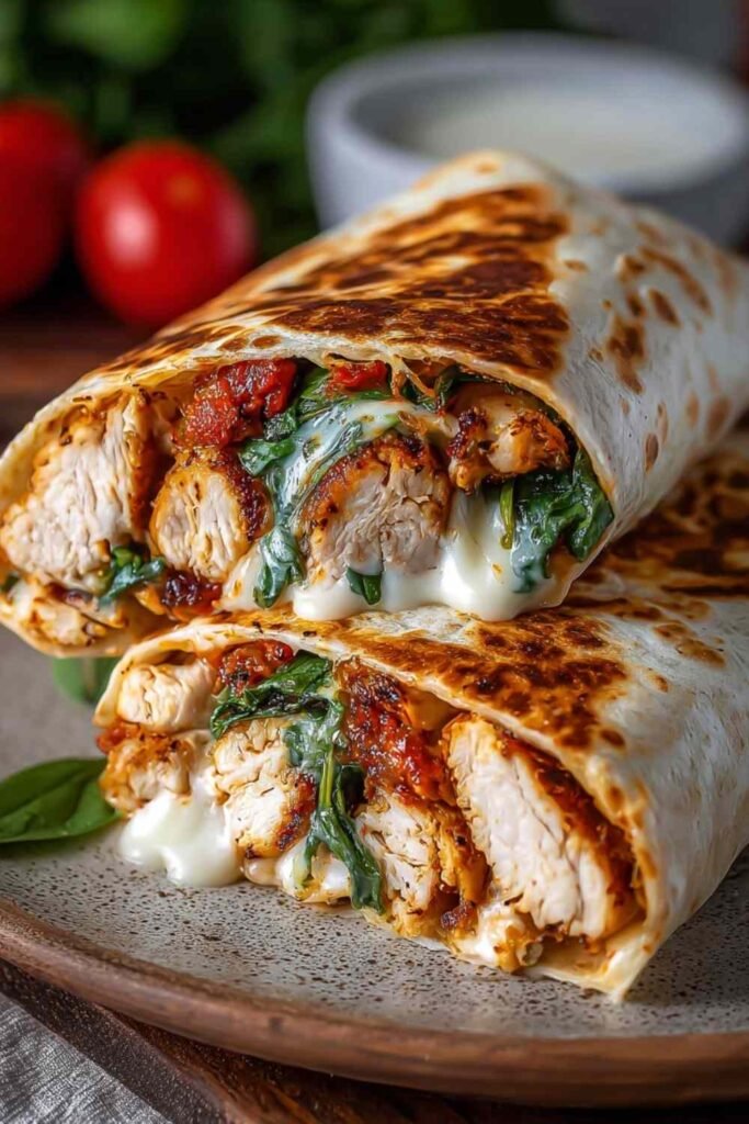 Step 3: While chicken cooks, prepare your wraps. On each tortilla, layer fresh spinach leaves first, then sprinkle a generous amount of mozzarella cheese. Once chicken is done, divide the hot strips among the four tortillas, placing them on top of the cheese.
