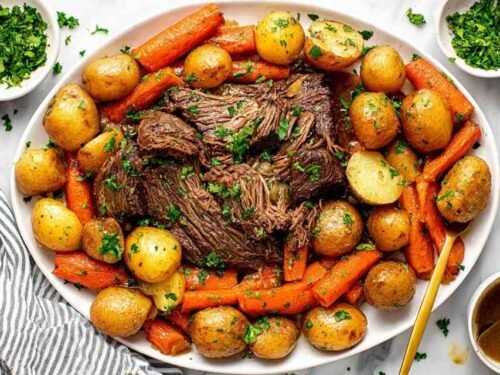 Roasted Potatoes with Baked Feta and Garlic: When you want a side that feels a little elevated, these roasted potatoes with creamy baked feta add a salty, crispy contrast that balances the richness of the pot roast beautifully.