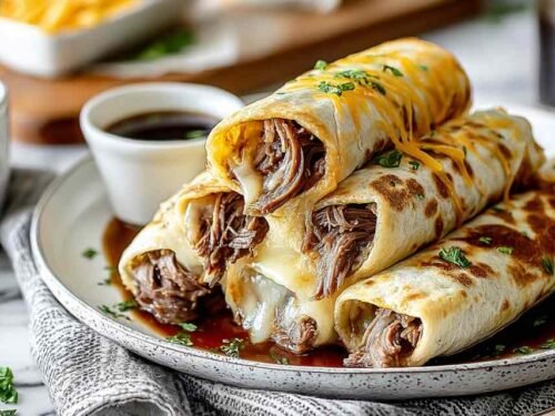 To reheat, I recommend placing the roll-ups on a baking sheet in a 350°F oven for 5 to 7 minutes to restore their crispness. Microwaving works in a pinch, but the tortillas won’t be as crispy. Reheat the au jus gently on the stovetop or in the microwave until steaming hot.