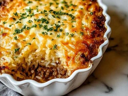 There’s something magical about opening the oven to find bubbly cheese stretching over a casserole that smells like a cozy French bistro. I stumbled upon this recipe on a particularly hectic Tuesday around 6 PM when I had leftover rice, ground beef thawing on the counter, and absolutely zero energy for complicated cooking. The smell of butter and beef hitting that hot pan was the first moment of calm in my entire day. What started as pure desperation quickly became one of our most-requested meals. The French onion soup adds unexpected depth that makes this simple casserole taste like you spent hours caramelizing onions, but really, it’s just smart ingredient choice. My 10-year-old doesn’t even realize she’s eating a well-balanced meal because she’s too busy scraping every last cheesy bite from her plate.