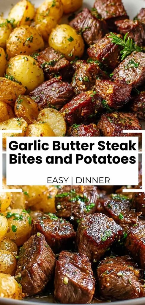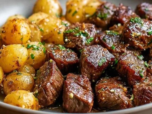 How to make tender steak bites and crispy potatoes in rich garlic butter sauce. This quick one-pan dinner delivers steakhouse flavors in just 30 minutes with simple ingredients.