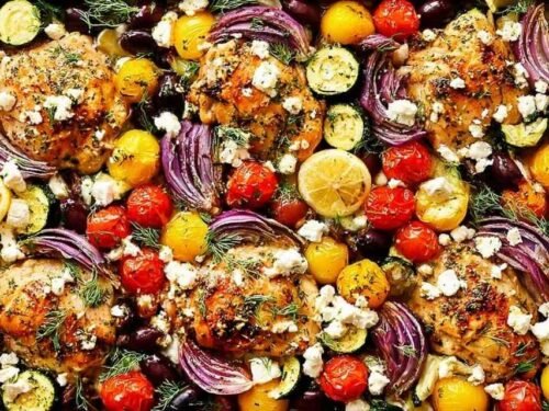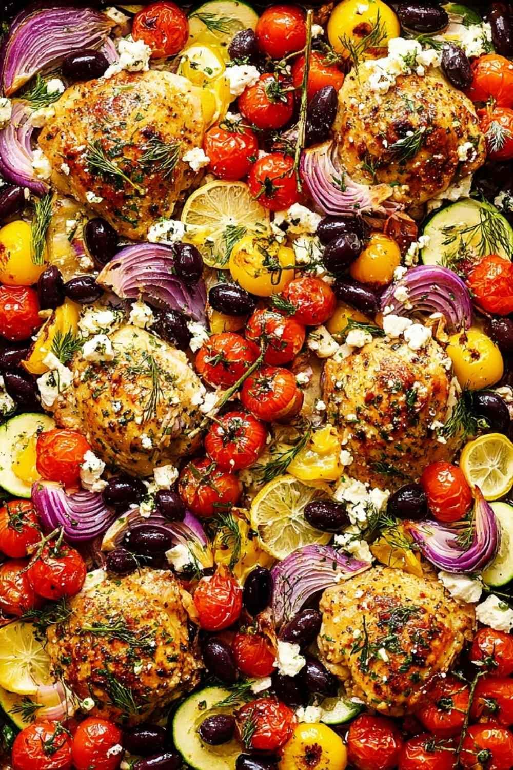 - Remove the pan from the oven and scatter the kalamata olives and crumbled feta over the vegetables. Return to the oven and bake for another 10 to 15 minutes, or until a meat thermometer inserted into the thickest part of the chicken reads 165°F and the skin is golden and crispy. If needed, broil for 1 to 2 minutes for extra color.