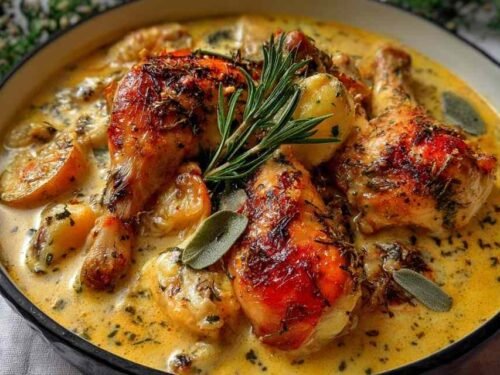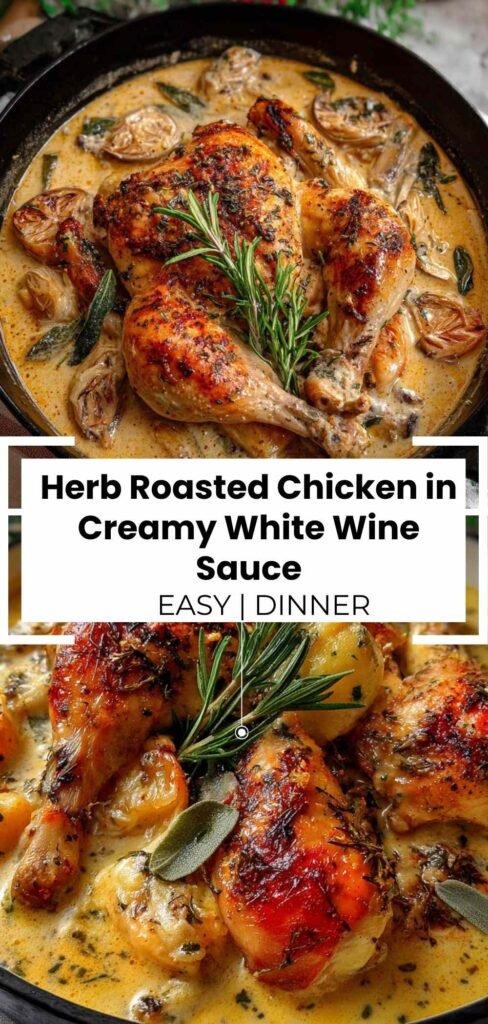 I love this rich and comforting dish that brings together tender chicken and earthy mushrooms in a silky wine sauce. My grandmother used to make something similar on chilly evenings when I was growing up in Colorado, and the aroma alone would bring the whole family running to the kitchen. She’d serve it with crusty bread for soaking up every drop of sauce, and we’d sit around the table long after our plates were empty, just talking and laughing. This Herb Roasted Chicken in Creamy White Wine Sauce captures that same warmth and comfort, with crispy golden skin, flavorful herbs, and a sauce so good you’ll want to soak up every last drop.