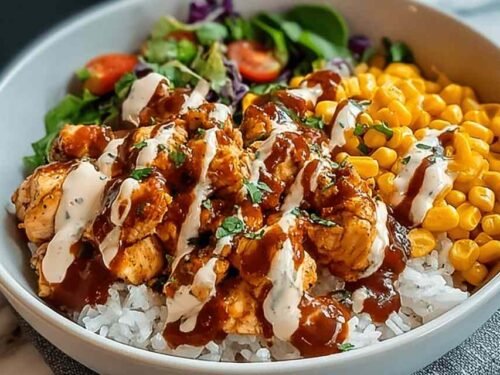 A nutritious and flavorful bowl featuring grilled chicken, fresh vegetables, and a creamy BBQ ranch sauce. Perfect for meal prep or quick weeknight dinners when using pre-cooked grains.