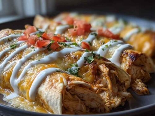 Tender chicken wrapped in whole wheat tortillas, topped with a creamy Greek yogurt sauce and baked to perfection. Each serving delivers over 25 grams of protein for a healthy, satisfying dinner.