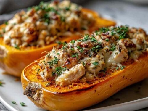 This Honey Roasted Butternut Squash Stuffed with Chicken is a sweet and savory dinner that combines caramelized squash with warmly spiced chicken filling. It’s the kind of recipe that looks impressive but comes together with simple ingredients you probably already have.