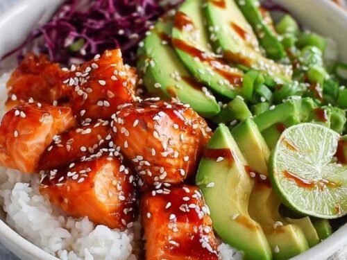 Sticky Garlic Chicken Noodles: If you’re feeding a crowd or want protein variety, these savory noodles complement the salmon bowls perfectly with their sweet-savory Asian flavors.