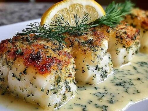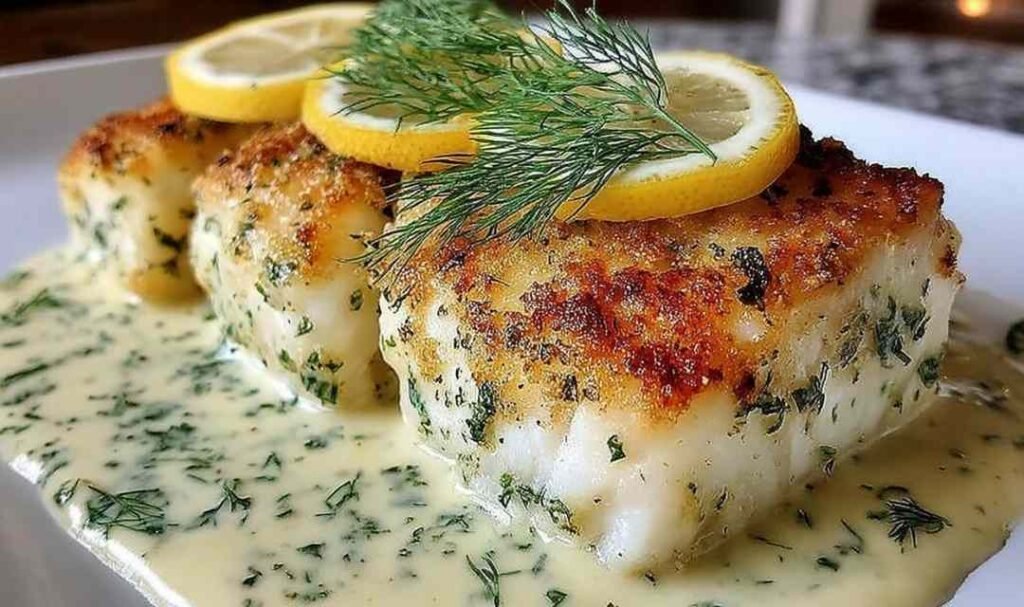 Step 5: Once the cod is perfectly cooked, transfer each fillet to a serving plate using a spatula. Spoon a generous amount of the lemon-dill sauce over the top and garnish with fresh lemon slices. Serve immediately while the fish is warm and tender.