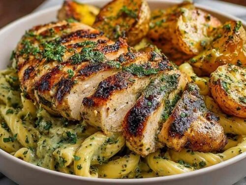 Loaded Herb Grilled Chicken with Creamy Pesto Pasta and Roasted Potatoes