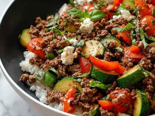 This Mediterranean Ground Beef Stir-Fry brings vibrant flavors to your weeknight table in just 30 minutes. The combination of seasoned beef, crisp vegetables, and tangy feta creates a restaurant-worthy meal without the usual time investment or cleanup hassle.