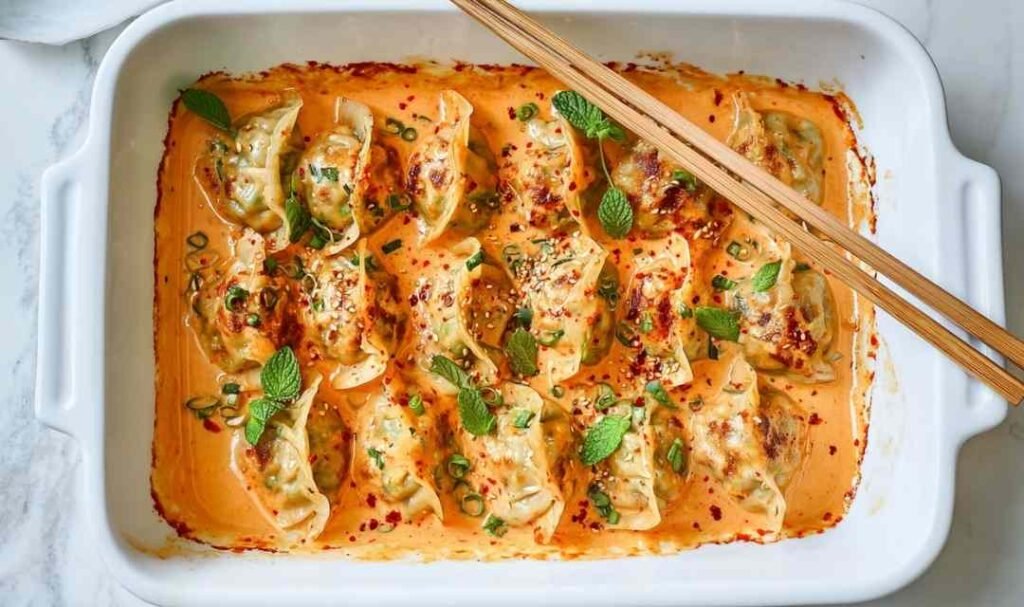 Step 5: The moment you pull the dish from the oven, scatter baby spinach over the hot dumplings if using – it wilts perfectly from residual heat. Top with cilantro, sliced green onions, sesame seeds, and drizzle with chili crunch oil. For extra-crispy tops, broil for 1 to 2 minutes about 6 inches from the heat source, watching carefully to prevent burning.
