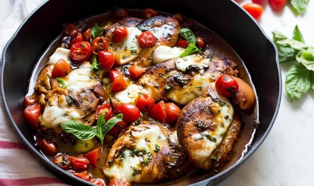 - Remove the pan from the heat and add the tomato mozzarella mixture over the chicken.