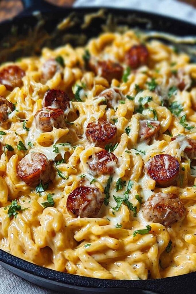 Swap the smoked sausage for turkey sausage or chicken sausage, use 2% milk instead of whole milk, and reduce the cheese to 1.5 cups. You’ll still get great flavor with fewer calories. Our Chicken Sausage and Broccoli Orzo is another lighter one-pan option worth trying.
