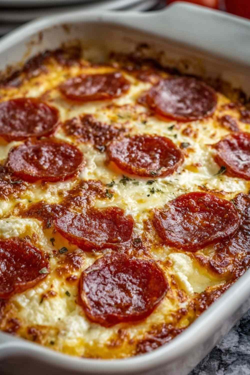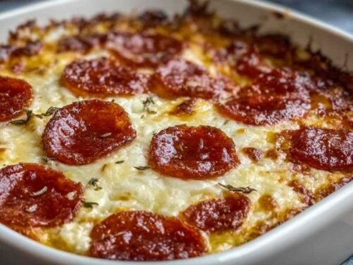 - Pour the mixture into the prepared baking dish. Top with the remaining pepperoni slices.
