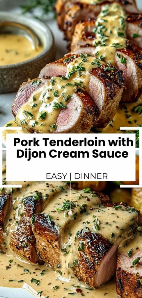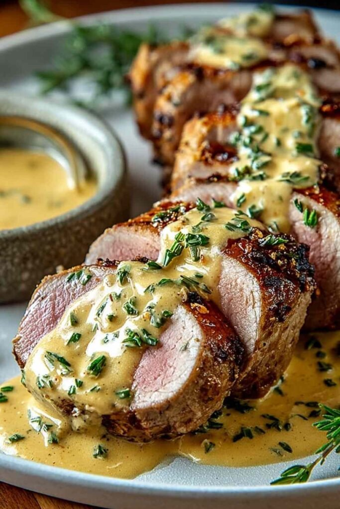 Step 7: Slice the rested pork into 1/2-inch thick medallions. Arrange on a serving platter and drizzle generously with the warm Dijon cream sauce.