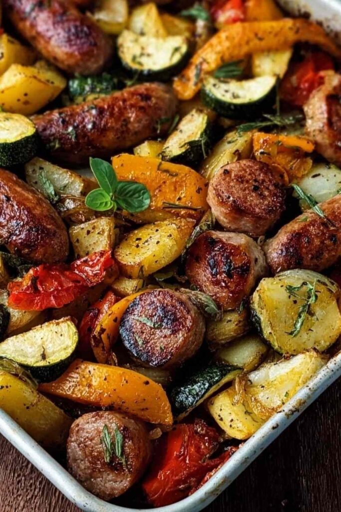 Crusty Bread: A warm baguette or sourdough loaf is perfect for soaking up the flavorful juices from the roasted vegetables and sausage. The crunchy exterior contrasts beautifully with the tender roasted vegetables.