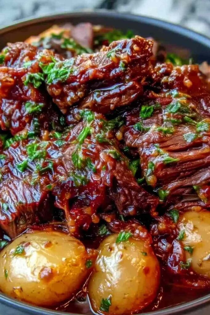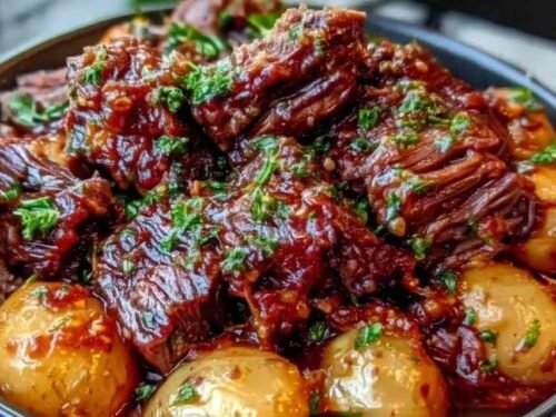 - Transfer beef and potatoes to a serving platter. Spoon extra sauce over the top, sprinkle with fresh parsley, and serve warm.