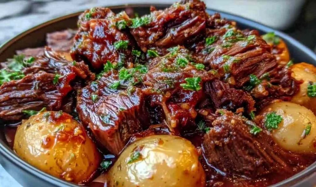 Step 8: Transfer the beef and potatoes to a serving platter, spoon the extra sauce over the top, sprinkle with fresh parsley, and serve immediately while hot.