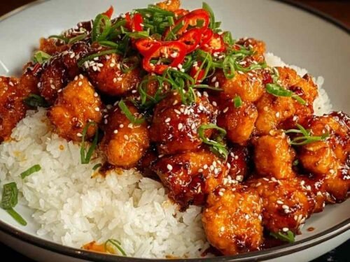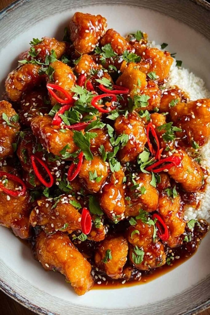 Step 7: Transfer the glazed chicken to your serving platter using a slotted spoon or tongs, sprinkle with sliced green onions and toasted sesame seeds, and serve immediately while it’s hot and glossy.